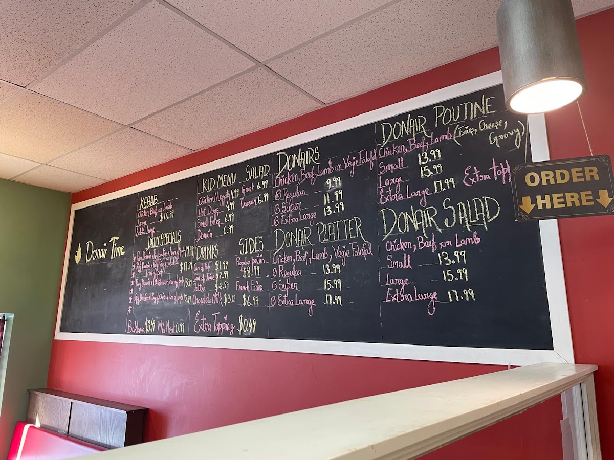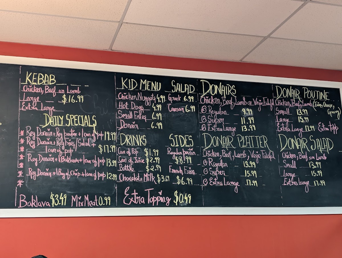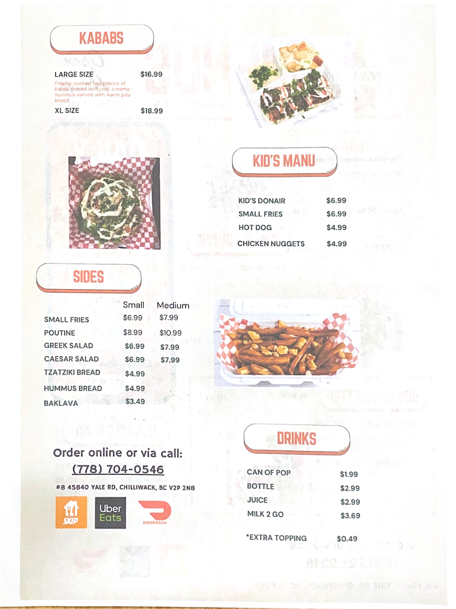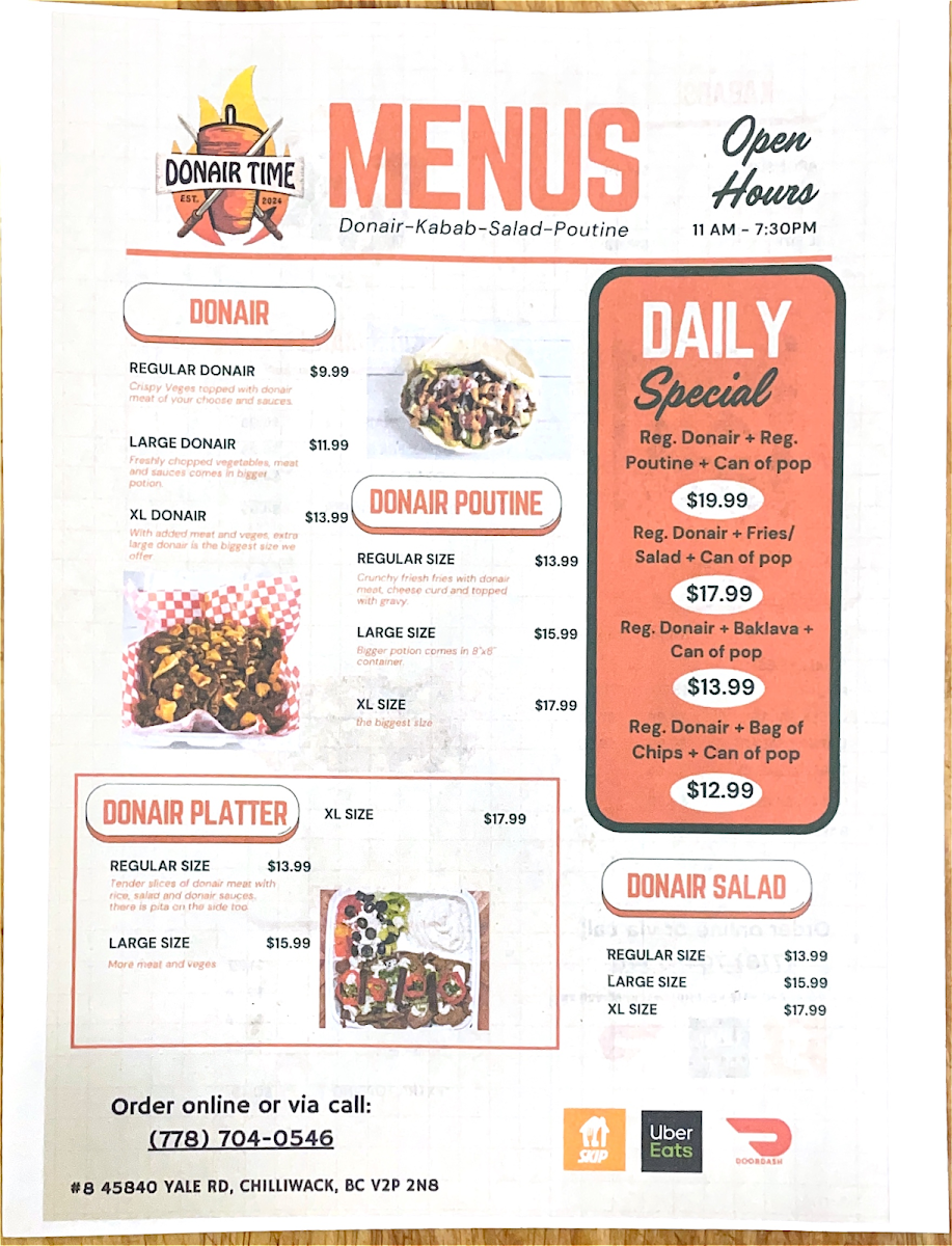 Donair Time offers a wide variety of flavorful dishes that cater to different tastes, with a special focus on its signature donairs. The menu features options such as the Chicken Donair, Beef Donair, and Lamb Donair, each available in different forms, including donair salads and platters. The Vegetarian Falafel Donair is also a great option for those seeking a meat-free alternative. For those craving something more substantial, the Kabab Platter and the X-Large Kabab Platter provide generous servings of delicious grilled meats. Donair Poutines, including Beef Donair Poutine, Chicken Donair Poutine, and Lamb Donair Poutine, offer a satisfying twist on the classic poutine. Salads are available in similar varieties, such as the Chicken Donair Salad, Beef Donair Salad, and Lamb Donair Salad, as well as the Vegetable Falafel Donair Salad. For lighter options, the Greek Salad and Cesar Salad are refreshing choices. The kid's menu features simple, tasty meals like the Kid's Hot Dog, Kid's Donair, Kid's Chicken Nuggets, and Kid's Small Fries. To complement these dishes, Donair Time offers a selection of delicious breads such as Tzatziki Bread and Hummus Bread. Sides like Poutine and French Fries make for perfect accompaniments, while the sweet Baklava dessert is the ideal way to finish off the meal. To drink, you can choose from bottled or canned pop, Gatorade, and Milk to Go. Whether you’re in the mood for a hearty platter, a light salad, or a tasty dessert, Donair Time offers something for everyone, making it a great place to satisfy your cravings.