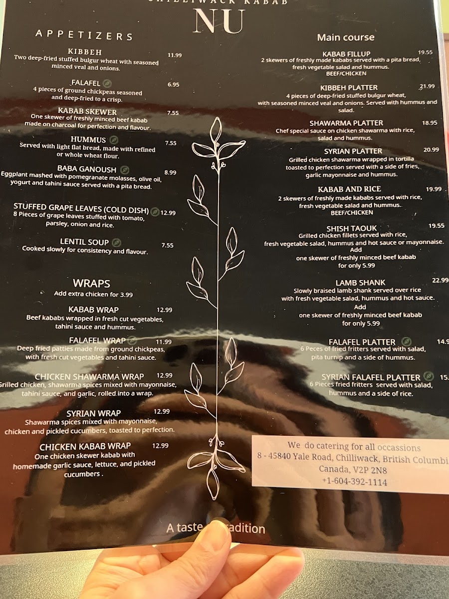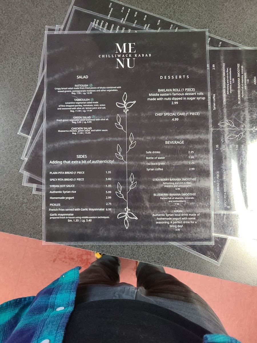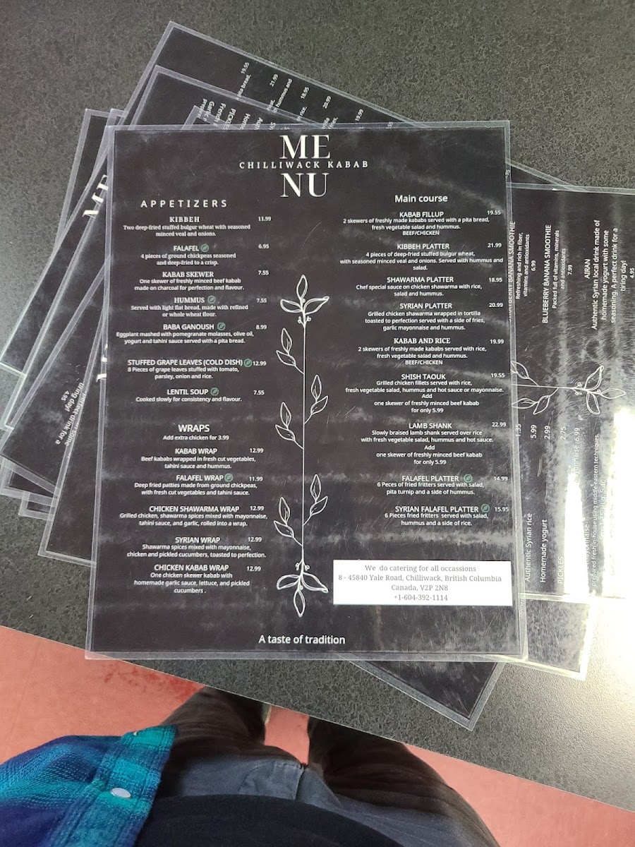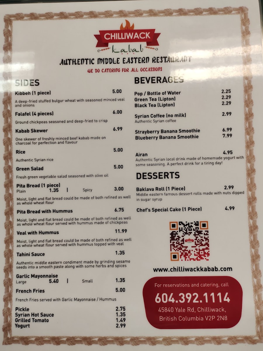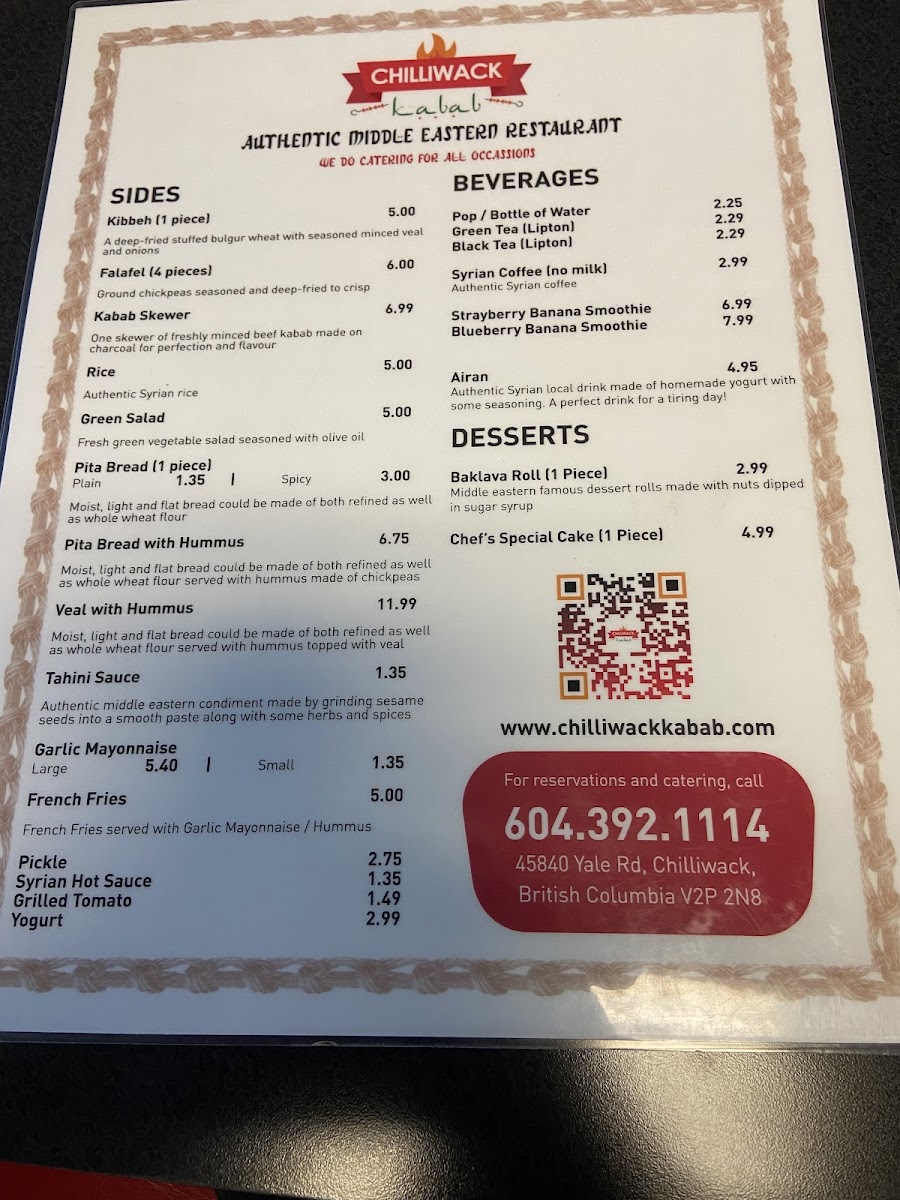 Mediterranean chicken doner with options for small to x-large. Choice of tahini, hummus, or spicy spread. Sauce options include tzatziki, sweet Halifax, garlic, among others. Feta or mozzarella cheese.